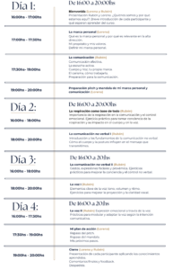 Este curso está diseñado para ayudarte a descubrir y potenciar tu identidad comunicativa, integrando estrategia, presencia y autenticidad. A lo largo de cuatro sesiones intensivas trabajarás aspectos clave como la comunicación efectiva, la escucha activa, el lenguaje corporal, la voz y el desarrollo de un mensaje claro que refleje quién eres y qué representas.